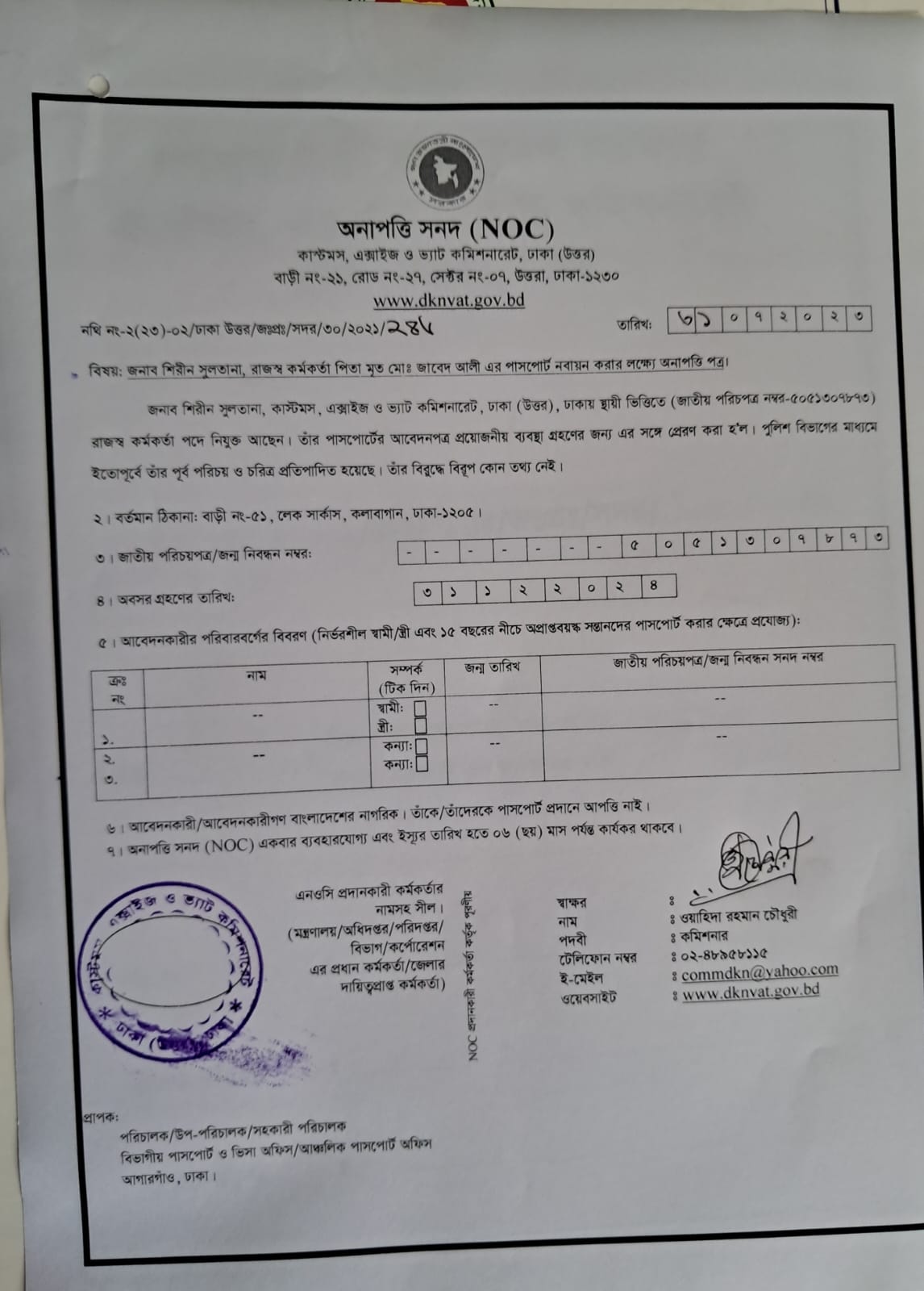 | 52 | মিজ্ শিরীন সুলতানা, রাজস্ব কর্মকর্তার এর পাসপোর্ট নবায়ন করার লক্ষ্যে অনাপত্তি পত্র। | 31-Jul-2023 |